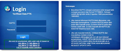 3. Login terlebih dahulu dengan memasukkan NO. NUPTK dan password-nya dengan tanggal lahir guru ybs, format pasword : YYYYMMDD. Contoh: jika tanggal lahir 18